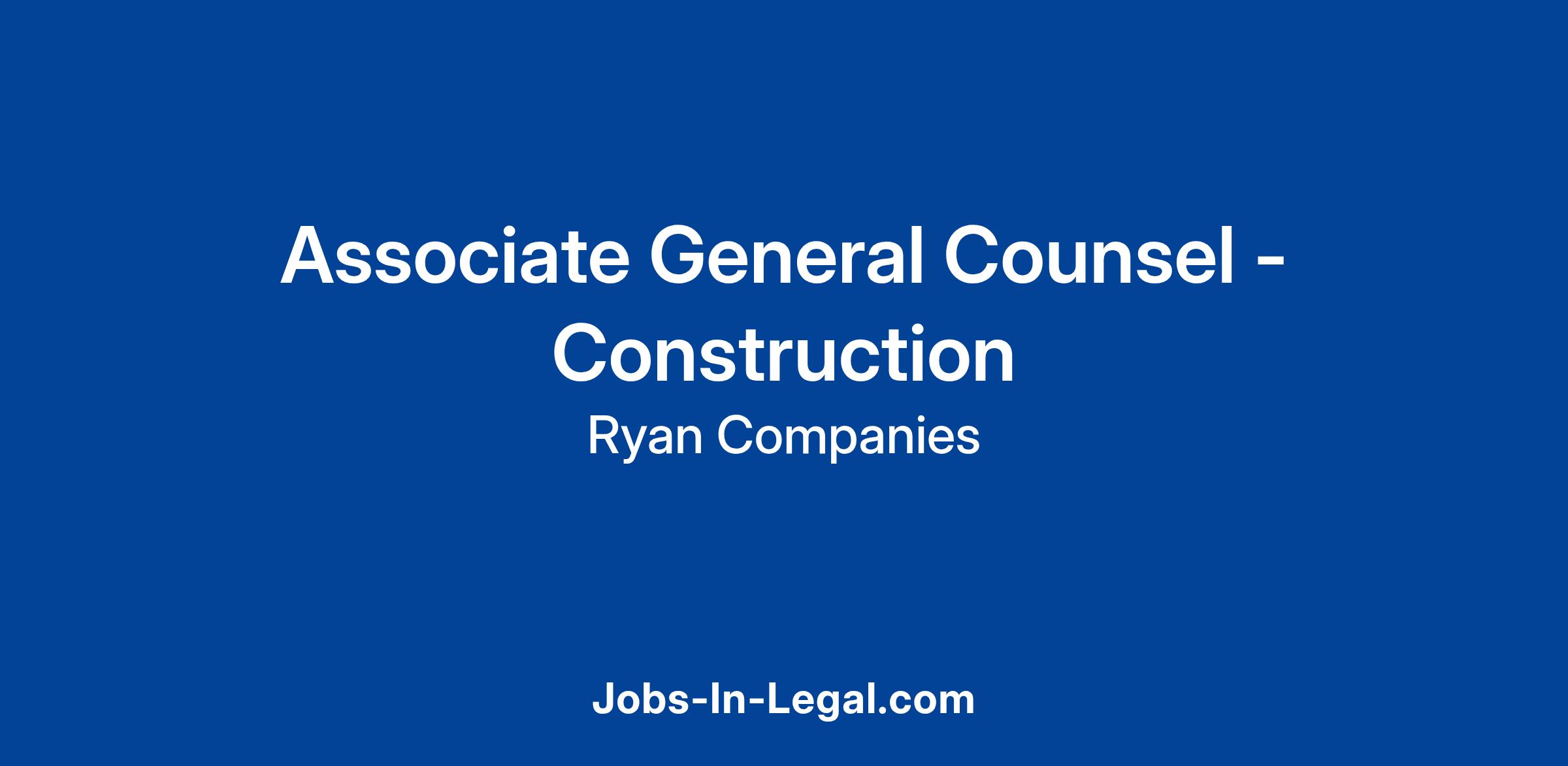 Ryan Companies US, Inc. has an immediate career opportunity for an Associate General Counsel - Construction in its Minneapolis office. This position will focus on managing risk, negotiating and drafting complex construction contracts, ensuring compliance with applicable laws and regulations, supporting project teams in delivering projects successfully and managing claims and litigation. The ideal candidate has strong experience in construction law, a collaborative mindset, and the ability to provide practical, business-oriented legal solutions in a fast-paced environment. Candidates with approximately 10 years of relevant legal experience are most likely to be successful.