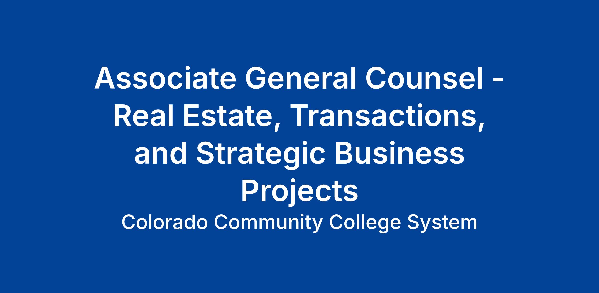 The Colorado Community College System (CCCS) is hiring an Assistant General Counsel – Real Estate, Transactions, & Strategic Business Processes (AGC) to join our System Office’s Legal team. This role will assist our colleges, which have over 35 campuses (and growing!) in the state of Colorado, with their real estate transactions. We are looking for an attorney who is well-versed in the world of real estate and who can communicate professionally with stakeholders at all levels. If you are looking to join a team that values a true work/life balance while giving you the opportunity to help communities across the state, this position may be for you! CCCS provides generous leave, excellent benefits, and flexible work schedules, including hybrid-remote work within the state of Colorado.