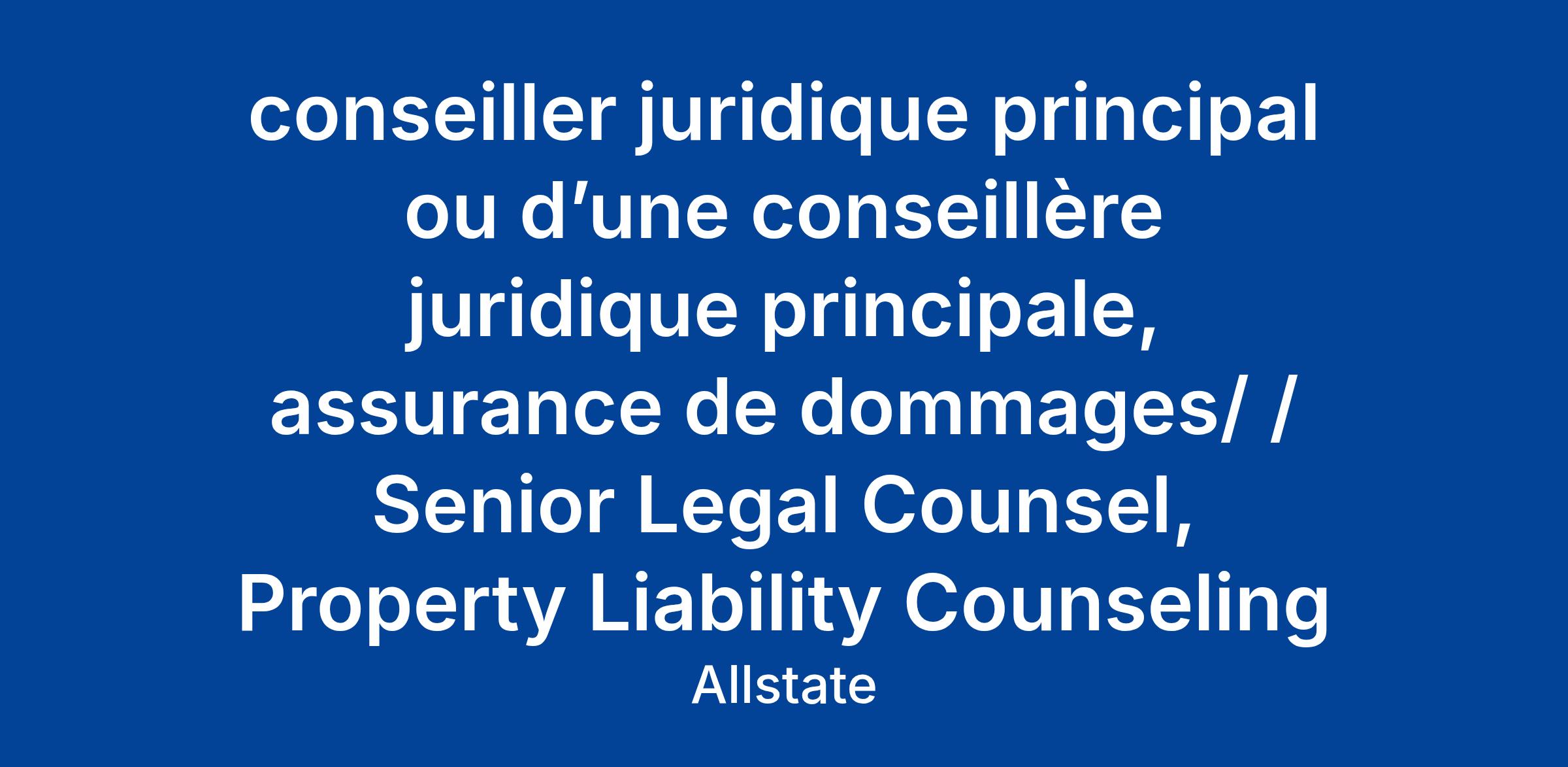 Le Groupe Allstate du Canada (GAC) est à la recherche d’un conseiller juridique principal ou d’une conseillère juridique principale, assurance de dommages, au sein de son Unité des lois et règlements, pour soutenir le marché du Québec. Le ou la titulaire du poste est une personne créative et dynamique qui s’intéresse aux liens qui unissent le droit, les affaires, l’assurance, ainsi que les relations gouvernementales. L’Unité des lois et règlements du GAC connait un essor pour soutenir nos unités d’affaires et l’ensemble des activités de l’entreprise. Le ou la titulaire de ce poste travaillera avec différents groupes d’intervenants au sein de l’entreprise et offrira un soutien clé aux équipes de produits, des risques, des technologies, de la distribution, des réclamations et du marketing.Offrir des conseils juridiques stratégiques axés sur les solutions pour permettre aux unités d’affaires d’atteindre leurs objectifs opérationnels tout en se conformant aux lois et aux règlements applicables.