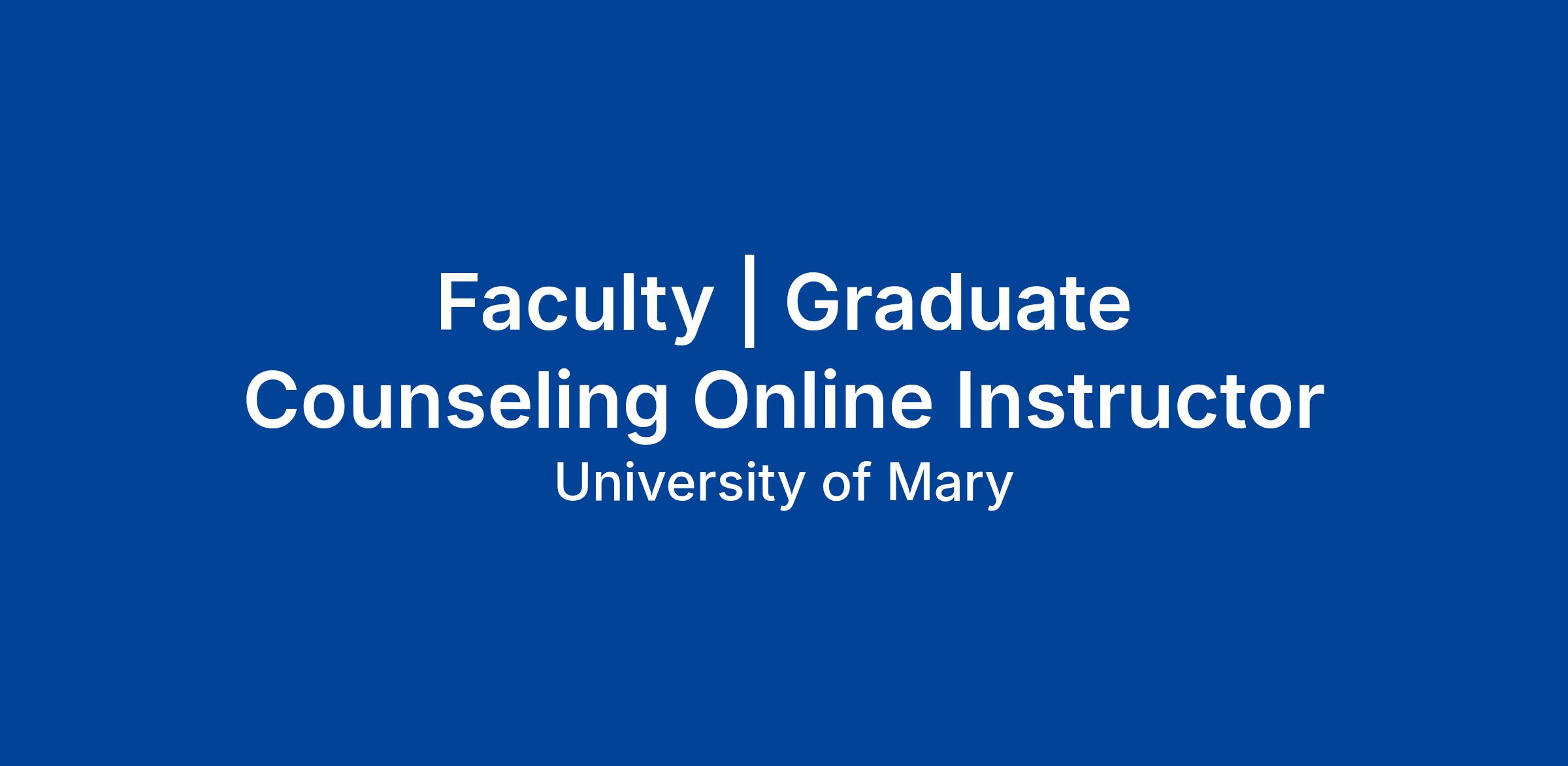 Graduate Counseling Online Instructor PositionThe University of Mary in Bismarck, ND invites applications for the position of instructor in the Graduate Counseling Program in the Liffrig Family School of Education and Behavioral Sciences. This position is remote full-time faculty rank 11-month position that includes online teaching, advising and administrative responsibilities in the Graduate Counseling Program. This position is directly responsible to the Chair of the Graduate Counseling Program.Faculty members are expected to demonstrate a willingness to support and advance the Christian, Catholic, and Benedictine mission and identity of the University of Mary (see https://www.umary.edu/about/mission-identity).Required Qualifications:- Experience in teaching graduate counseling courses