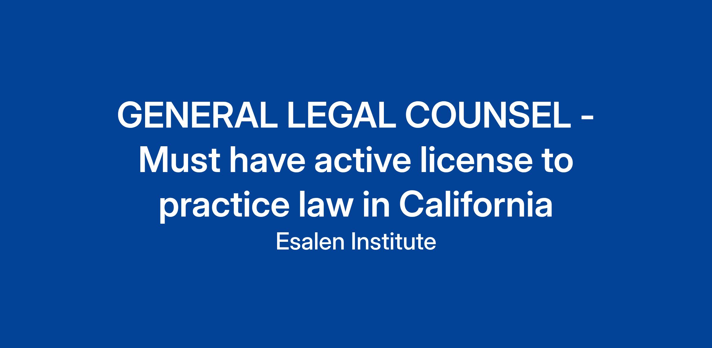- The General Legal Counsel serves as Esalen Institute’s primary legal officer and primary legal advisor to the Chief Executive Officer, Senior Leadership Team, and Board of Directors. This role is responsible for providing strategic, practical, and mission-aligned legal guidance across the organization while safeguarding Esalen’s legal integrity, governance standards, and long-term sustainability. The General Legal Counsel plays a critical role in enabling organizational effectiveness by managing risk thoughtfully rather than defensively and ensuring compliance without impeding innovation or mission delivery. This position reports directly to the Chief Executive Officer.