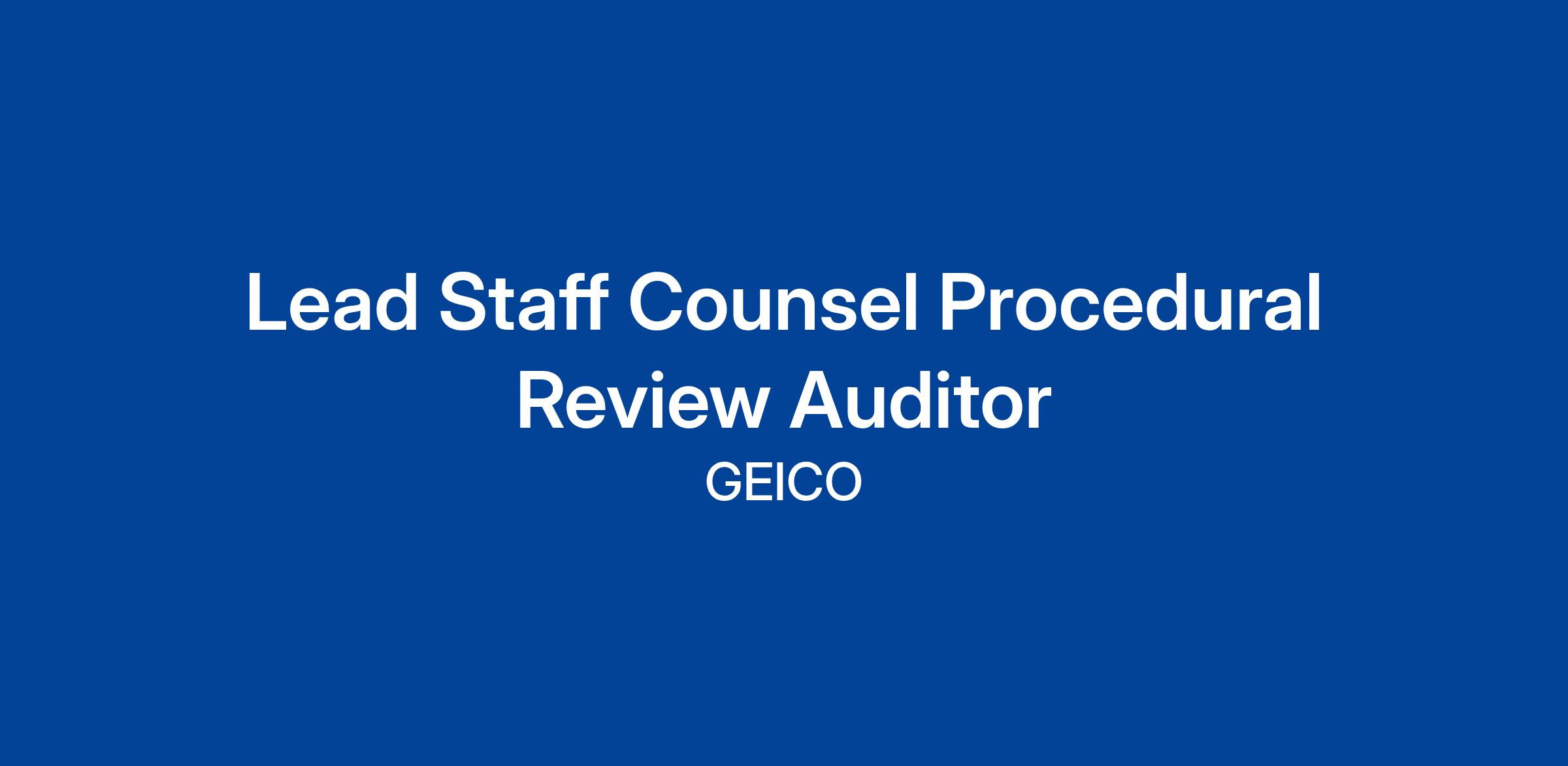 GEICO is seeking a Staff Counsel Procedural Reviewer to join our Staff Counsel team. Job duties include conducting audits of Staff Counsel files to ensure quality file handling and reviewing office practices to ensure they are in accordance with departmental procedures, standards, and best practices.