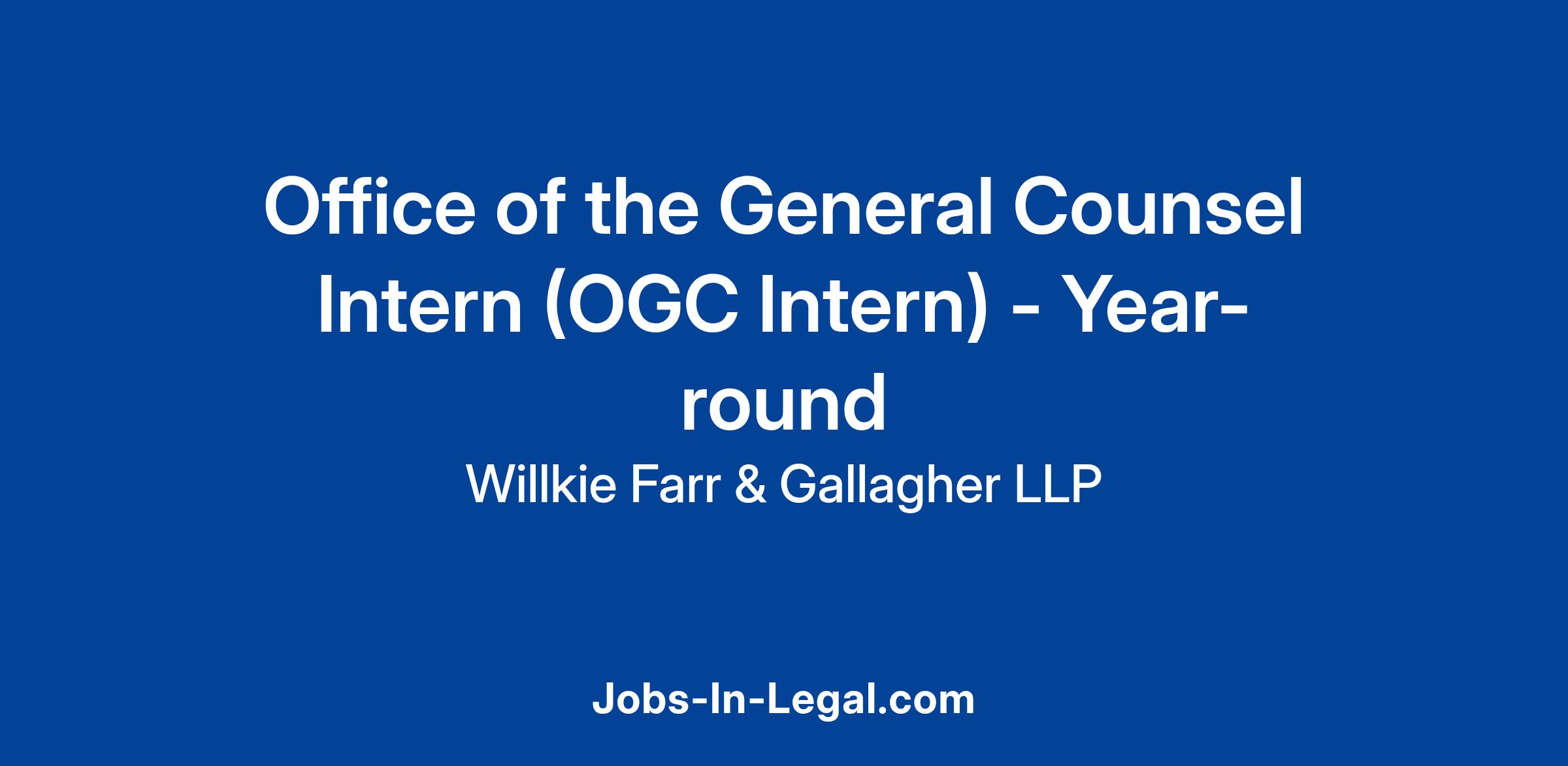 The New York office of Willkie Farr & Gallagher LLP is looking for an OGC (Office of the General Counsel) Intern based in the New York office. Willkie is an elite international law firm of approximately 1,300 lawyers located in 16 offices in six countries.