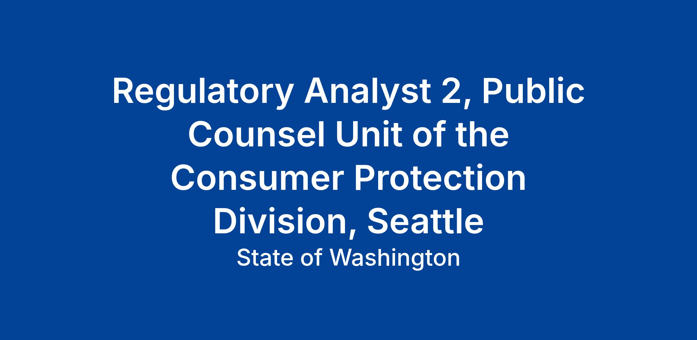 The Attorney General’s Office is recruiting for a permanent full time Regulatory Analyst 2 in the Public Counsel Unit of the Consumer Protection Division. This position is located in Seattle, Washington, and is represented by the Washington Federation of State Employees (WFSE).