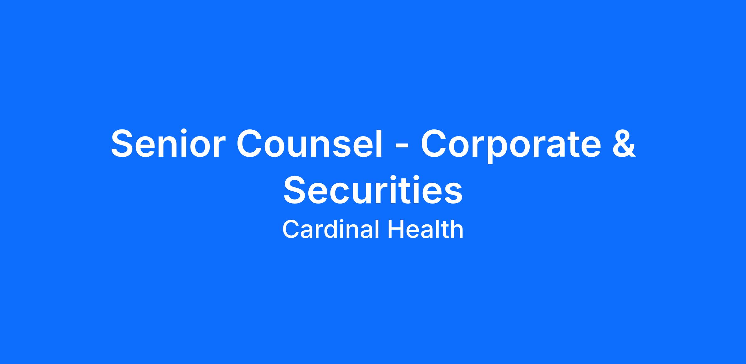 This position is a senior counsel role and will be part of Cardinal Health’s corporate legal team focusing on securities reporting work and other corporate matters. This role will be responsible providing legal advice, counsel and related services to Cardinal Health’s corporate function in all aspects of securities and corporate work.