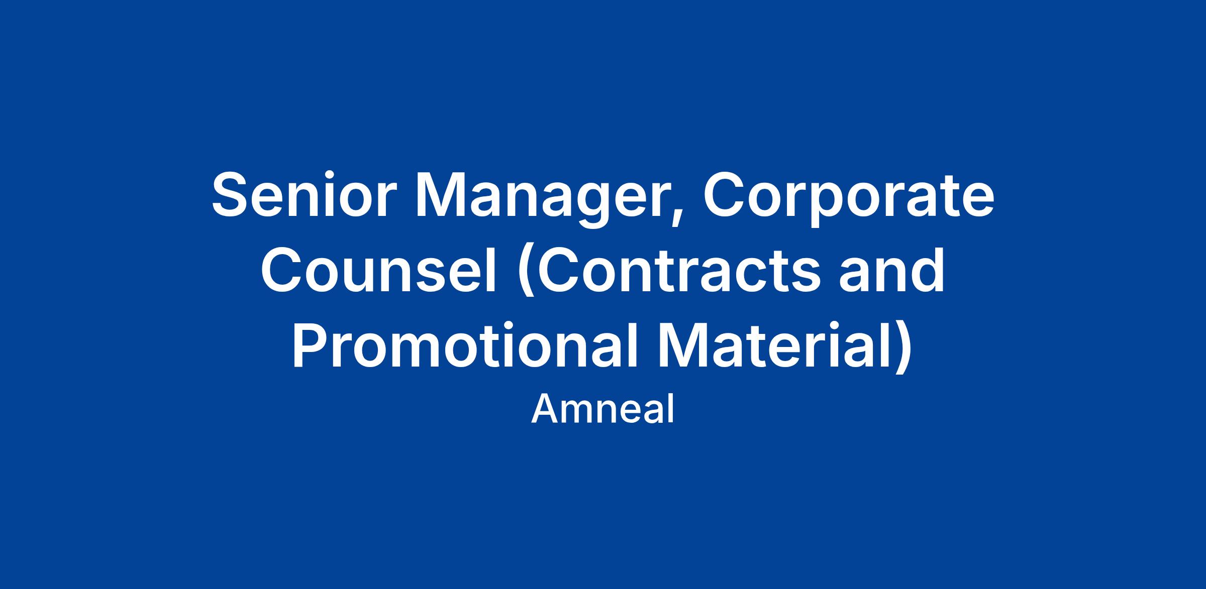 The Senior Manager, Corporate Counsel will be an integral member of the Amneal Legal team and will serve as a trusted legal advisor for all commercial activities involving the company's specialty, biosimilar and generic products. The incumbent will serve as a member of Amneal's promotional assets review committee (PARC), draft/review/negotiate general commercial and other types of contracts, and handle market access/customer-facing contracting.