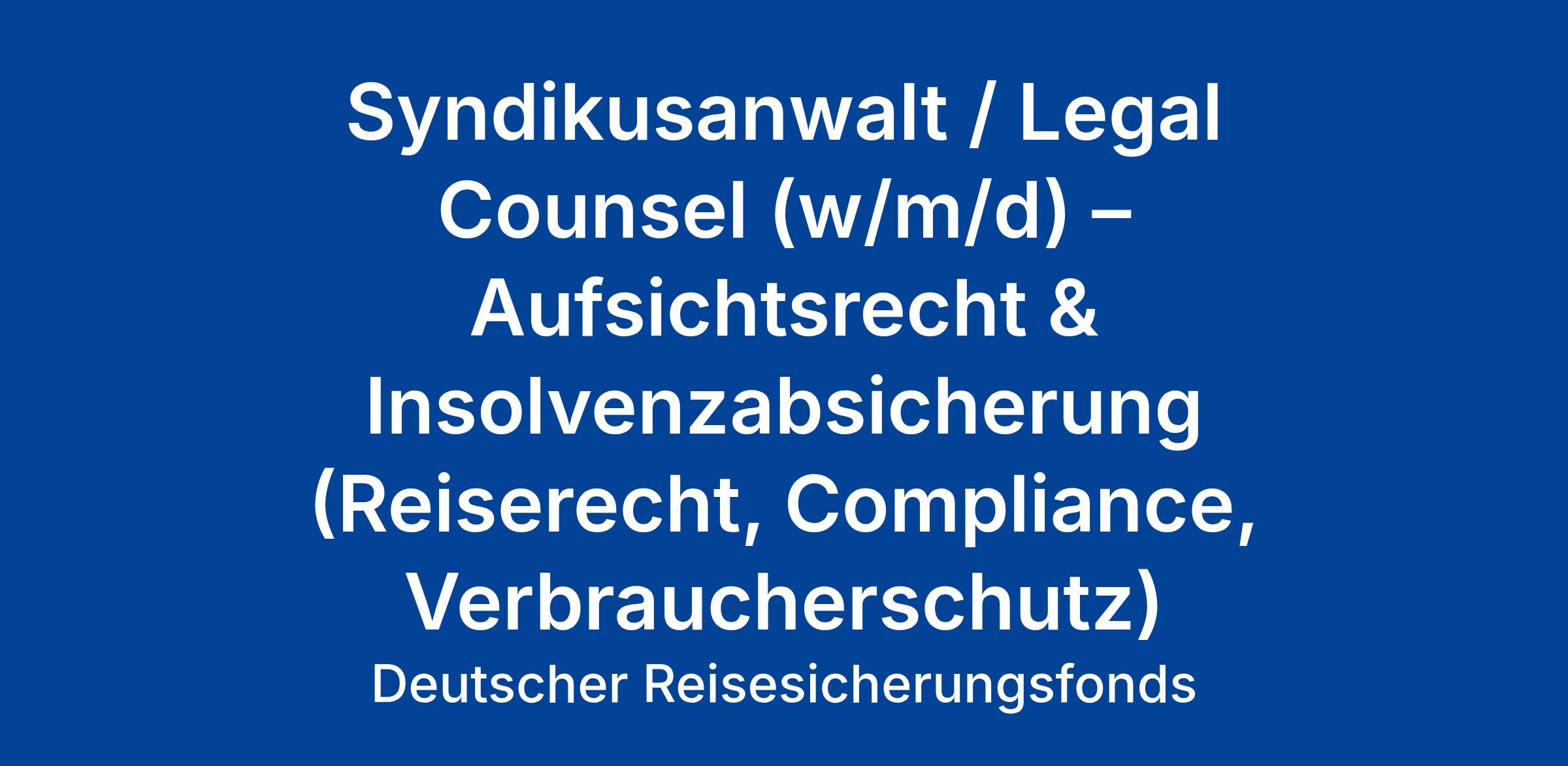 Du bist Volljurist (m/w/d) und willst mit deinem Know-how im Aufsichtsrecht, Compliance und Verbraucherschutz einen echten Unterschied machen? Beim Deutschen Reisesicherungsfonds (DRSF) gestaltest du als Syndikusanwalt / Legal Counsel (w/m/d) aktiv die Insolvenzabsicherung für Pauschalreisen – gemeinsam mit einem engagierten Team im Bereich Reiserecht und Regulierung.