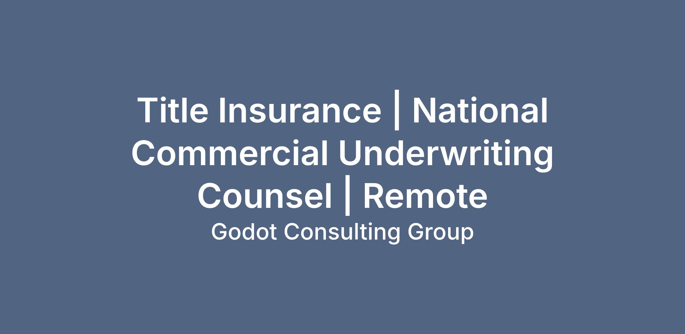 DescriptionGodot Consulting Group is excited to announce an opening for a National Commercial Underwriting Counsel. This position involves working with clients on complex commercial real estate transactions, providing legal expertise in underwriting and risk assessment. The ideal candidate will have extensive experience in title insurance, commercial real estate law, and a deep understanding of the underwriting process. At Godot Consulting Group, we aim to connect talented individuals with career opportunities that allow them to shine in their fields. All inquiries are exclusively confidential.