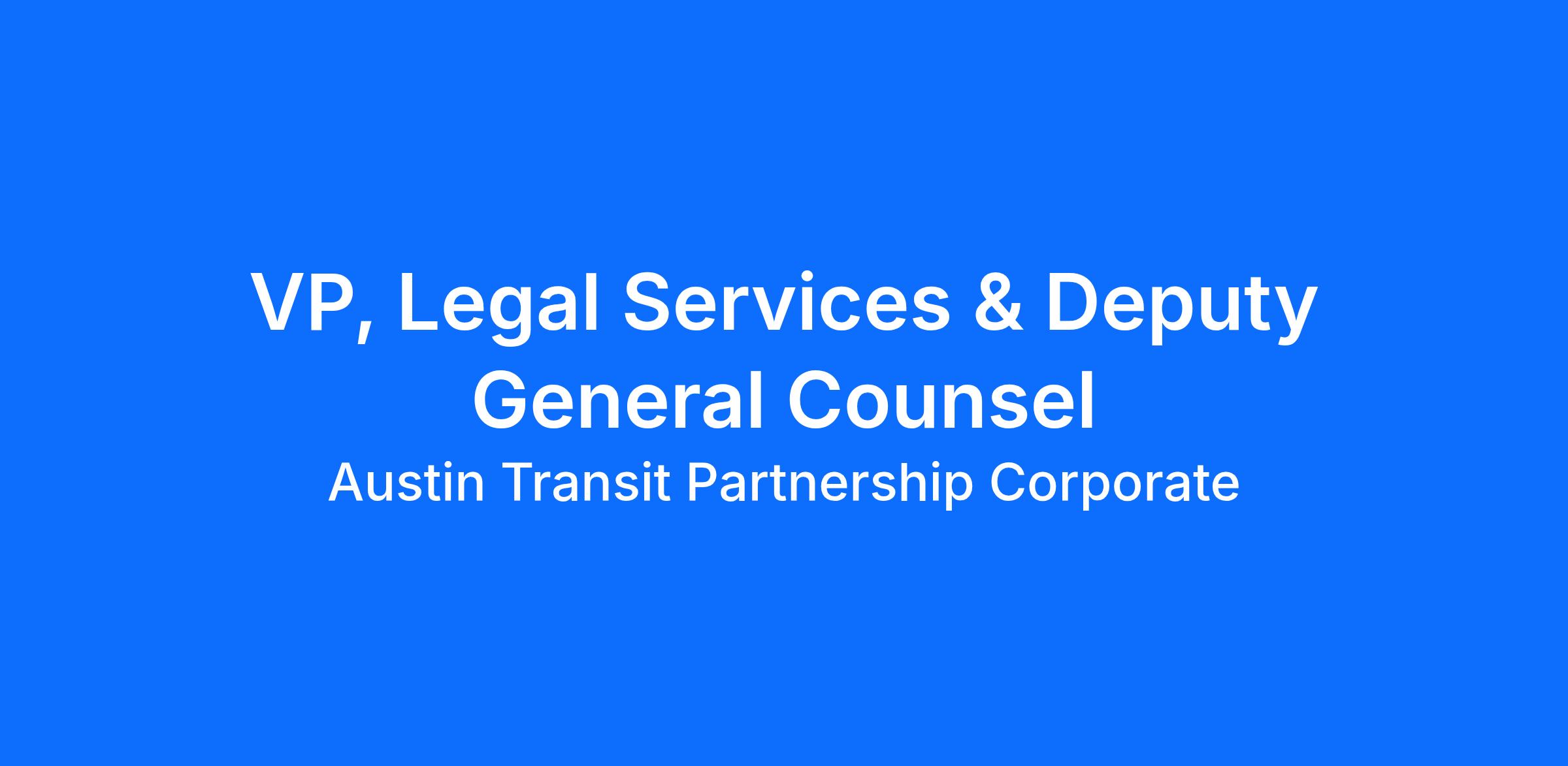 The VP of Legal Services & Deputy General Counsel works closely with the organization’s executive leadership and administrative staff under the direction of the General Counsel. This role supports the comprehensive legal affairs of Austin Transit Partnership (ATP), including litigation, policy, contracts, governance, and legal guidance, and helps ensure that ATP meets all applicable legal compliance obligations and successfully achieves its business goals.